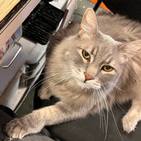 Ender was a sweet, good boy. He was larger than life, though a bit anxious! After being adopted alongside Emma in 2010, he would often hide behind the front counter and hang with the staff, but on the rare occasion you could spot him, he'd be crunching numbers on the front calculator, sleeping up in the cat walk, or eating his favorite treats. One of Ender's favorite activities was making a nest in a box of packing materials and sometimes we'd go hours without seeing him, before he'd pop his sleepy head out for dinner. We said goodbye to his quiet little meow in late 2024.